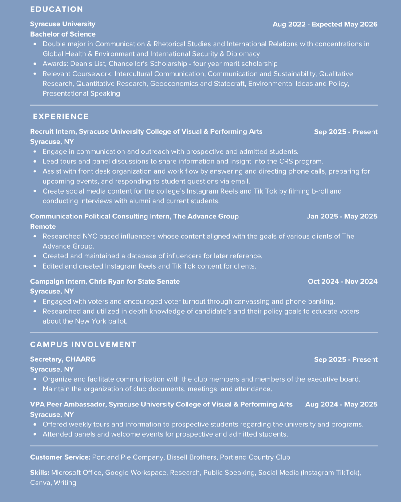 Iām a Communication & Rhetorical Studies and International Relations student passionate about combining strategic communication with global perspectives to help nonprofits connect communities with vital resources. My academic background has provided me with an in-depth understanding of structural barriers while also equipping me with the skills to address them through strategic communication, advocacy, and relationship building. I am looking to apply my knowledge to support my community in healthcare, food access, and nonprofit work.